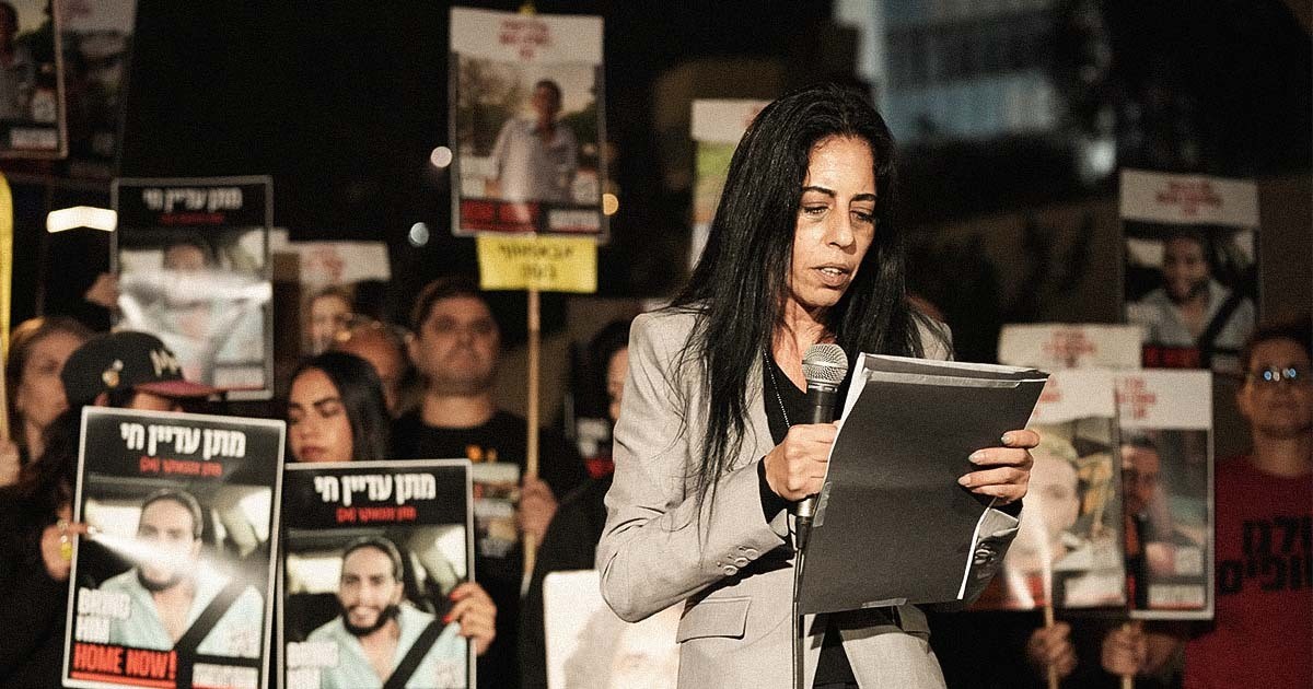 Einav Zangauker talar om en video av Hamas, där hennes son, Matan Zangauker, beskriver livet som gisslan i Gaza, Tel Aviv, den 7 december 2024. Foto: Mahmoud Illean/AP/TT