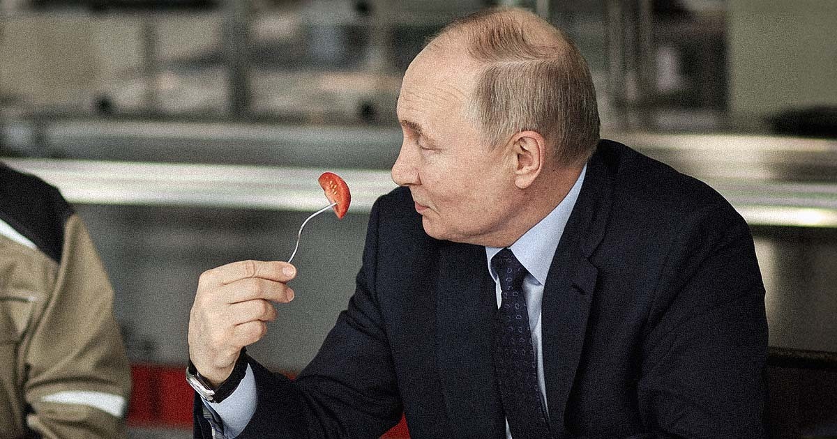 Rysslands president Vladimir Putin äter tomat under ett besök vid växthusanläggningen Solnechniy Dar nära Stavropol, Ryssland, tisdagen den 5 mars 2024. Foto: Mikhail Metzel/AP/TT
