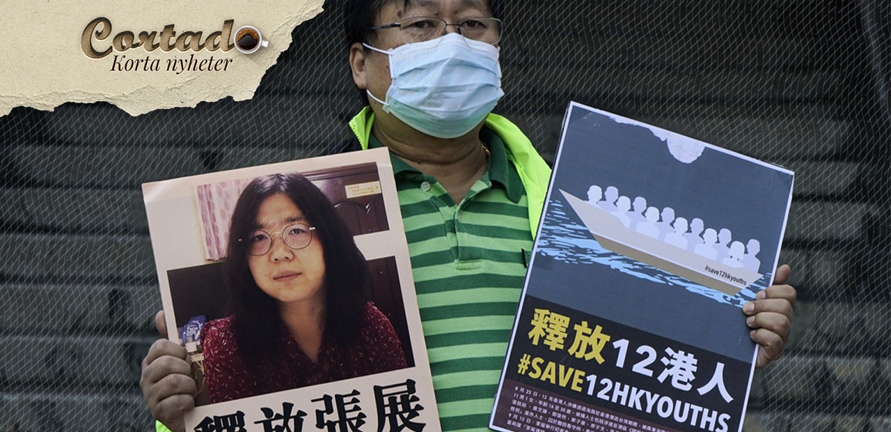 En demokratiaktivist demonstrerar i Hongkong 2020 med krav på att journalisten Zhang Zhan ska släppas fri. Foto: Kin Cheung/AP/TT