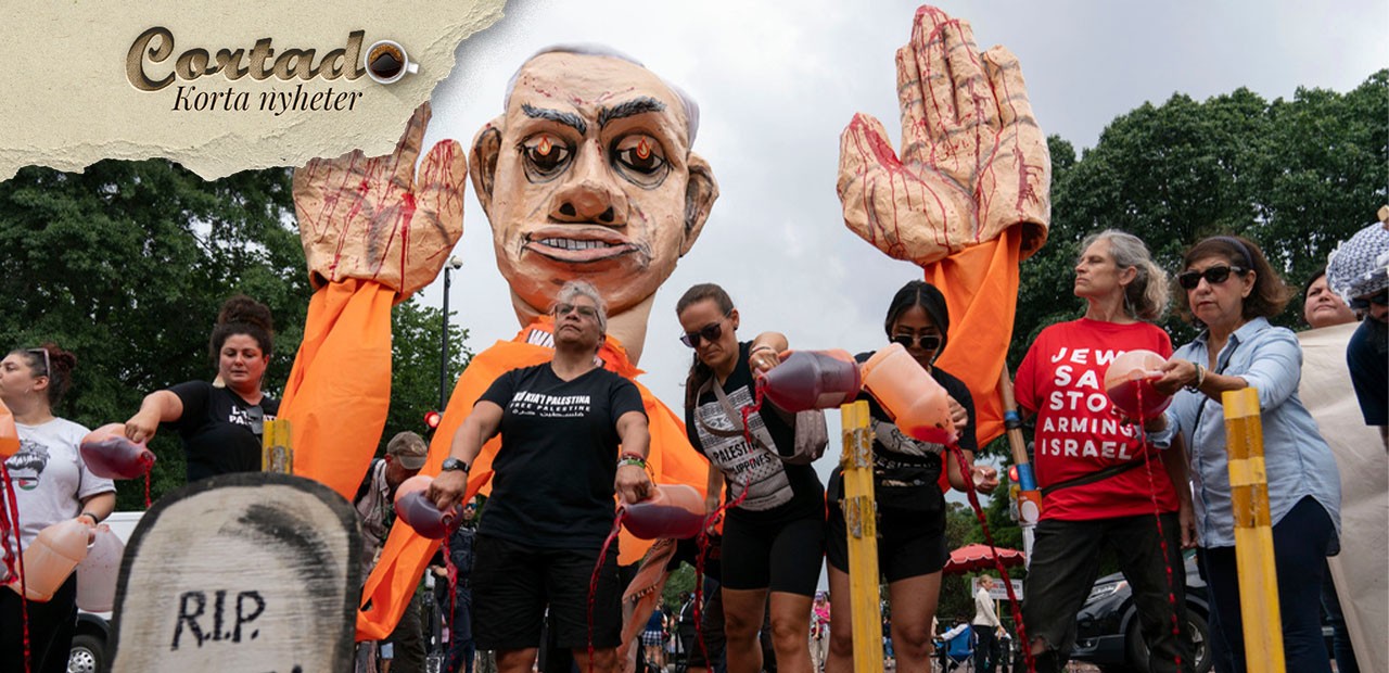 Demonstranter i Washington häller ut röd färg som symboliserar blod runt en docka av Israels president Netanyahu. Foto: Jose Luis Magana/AP/TT