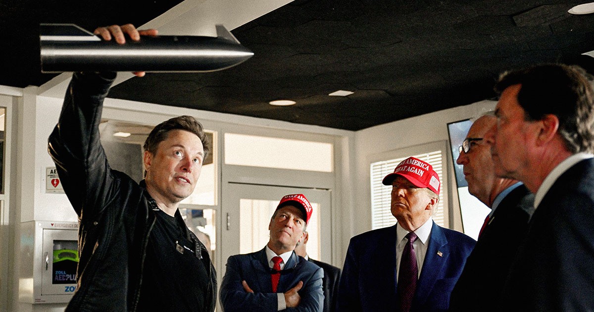 USA:s tillträdande president Donald Trump lyssnar när Elon Musk förklarar förberedelserna inför den sjätte testflygningen av SpaceX Starship-raketen, tisdagen den 19 november 2024. Foto: Brandon Bell/AP/TT