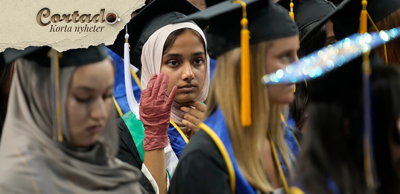 En student håller en röd handske för att protestera under en invigningsceremoni inne i Pauley Pavilion på UCLA campus i Los Angeles, fredagen den 14 juni 2024. Foto: Damian Dovarganes/AP/TT