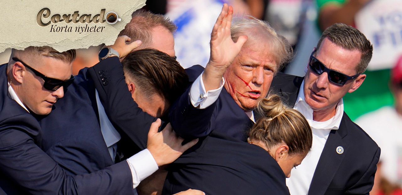 Den republikanske presidentkandidaten och före detta presidenten Donald Trump hjälps av scenen av amerikanska Secret Service-agenter efter mordförsöket under ett kampanjevenemang i Butler, Pennsylvania, lördagen den 13 juli 2024. Foto: Gene J. Puskar/AP/TT