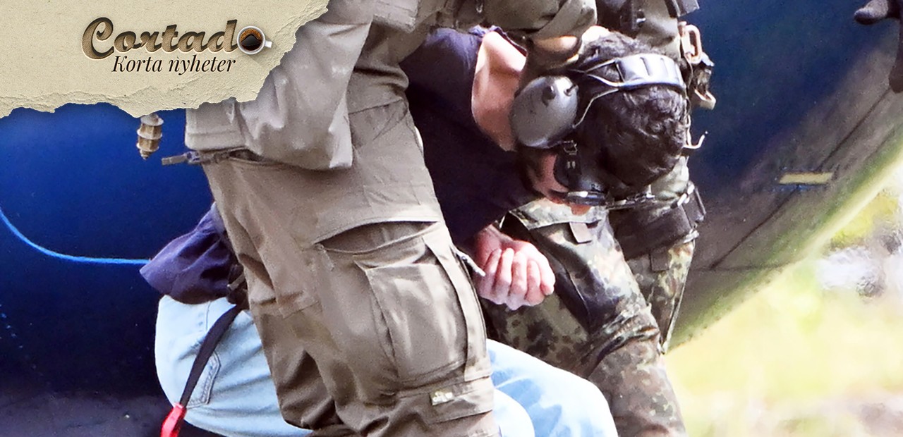 Den misstänkte gärningsmannen till knivattacken i Solingen eskorteras från en helikopter i Karlsruhe, Tyskland, söndagen den 25 augusti 2024. Foto: Uli Deck/AP/TT