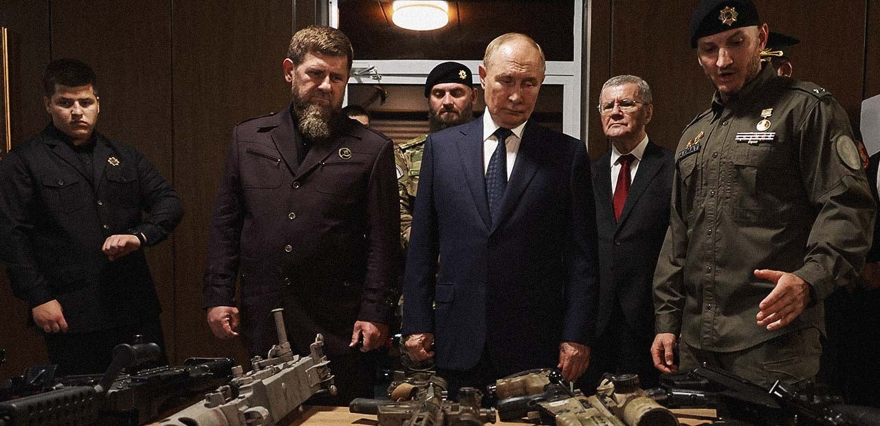 Rysslands president Vladimir Putin inspekterar Nato-militärtroféer under sitt besök på de ryska specialförbandens universitet i Gudermes, Tjetjenien, tisdagen den 20 augusti 2024. Foto: Vyacheslav Prokofyev/Sputnik