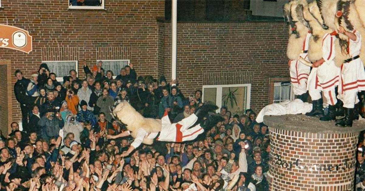 En person hoppar från en reklampelare på Westerstraße under Klaasohm-festivalen, Borkum, Tyskland, måndagen den 6 december 1999. Foto: Wikimedia Commons
