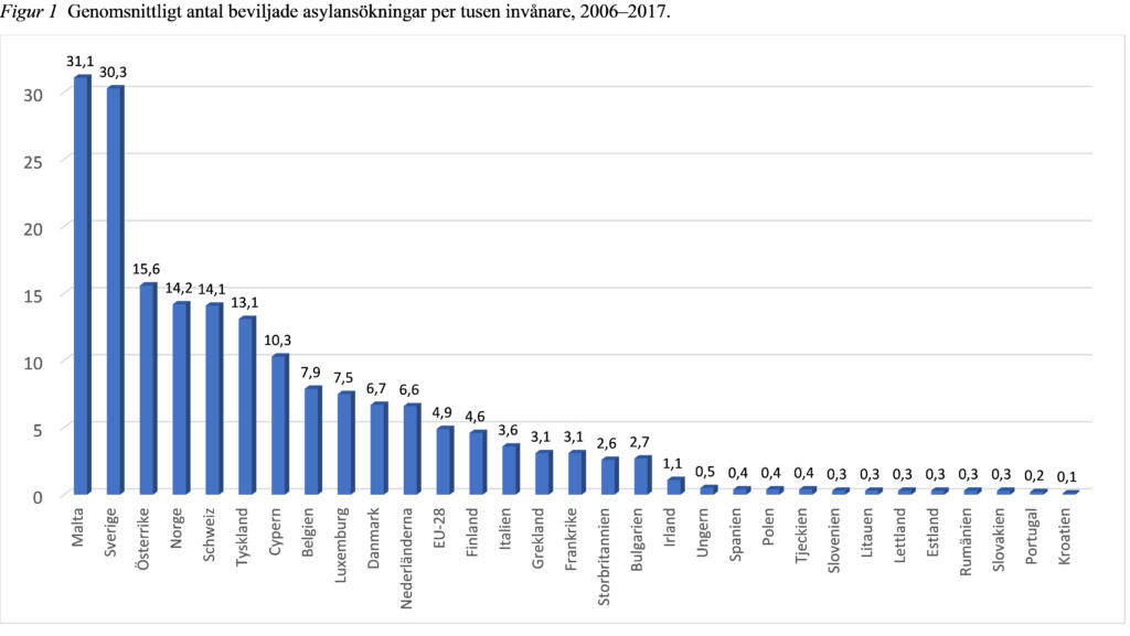 “Sverige, det land som beviljat näst flest flyktingar asyl relativt sin befolkning, beviljar 192 gånger fler asylansökningar per tusen personer än Portugal.”