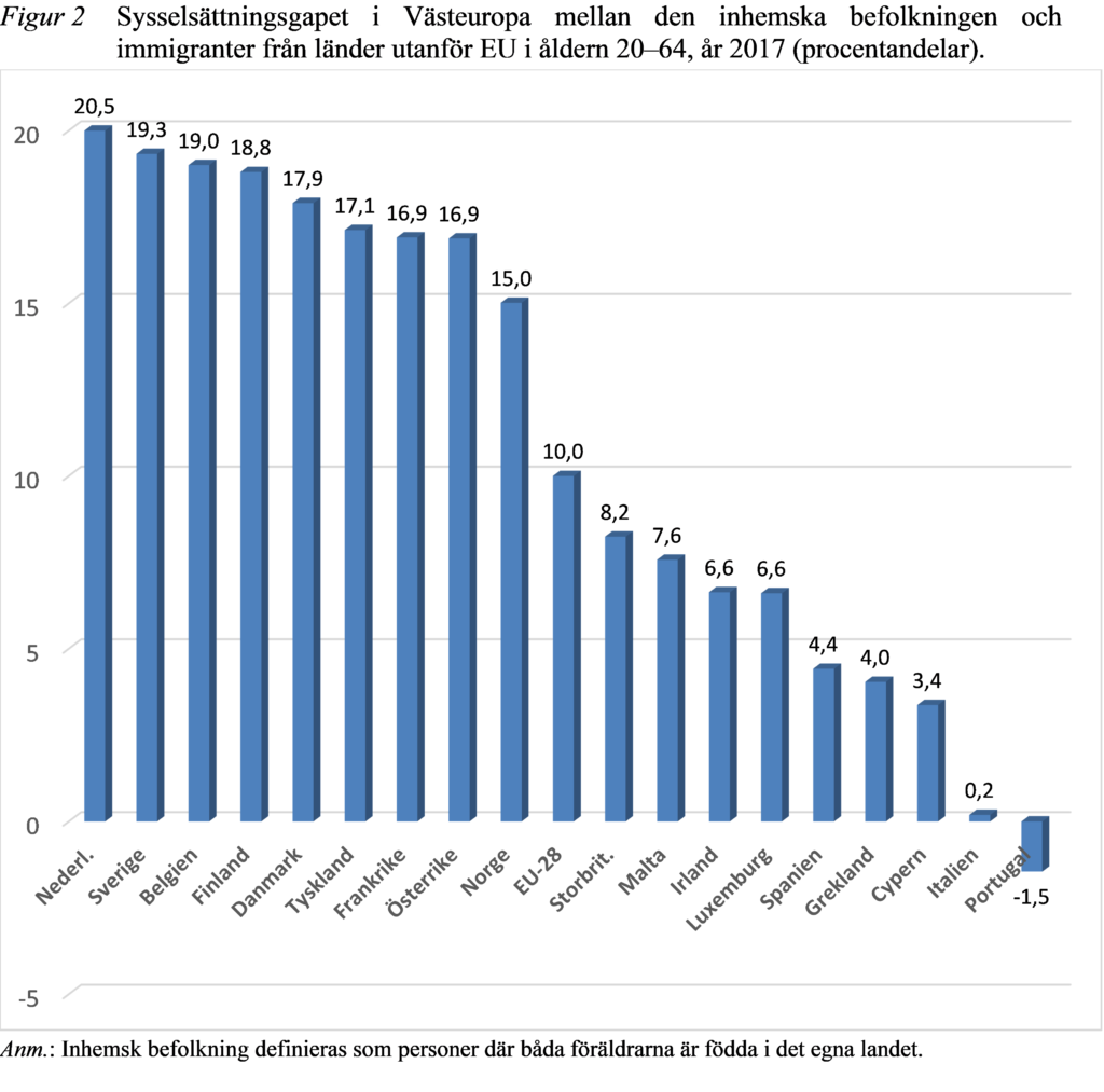Sysselsättningsgapet – det vill säga skillnaden i den andel av befolkningen i yrkesaktiv ålder som har ett jobb – mellan den inhemska befolkningen och immigranter från länder utanför EU kan redovisas för samtliga länder i närtid, medan sysselsättningsgapet för flyktingar bara kan redovisas för vissa länder (med några års eftersläpning). Figur 2 visar att sysselsättningen är klart lägre för invandrare som inte kommer från EU-länder än för den inhemska befolkningen. Undantaget är Portugal som nästan inte tagit emot några flyktingar alls.