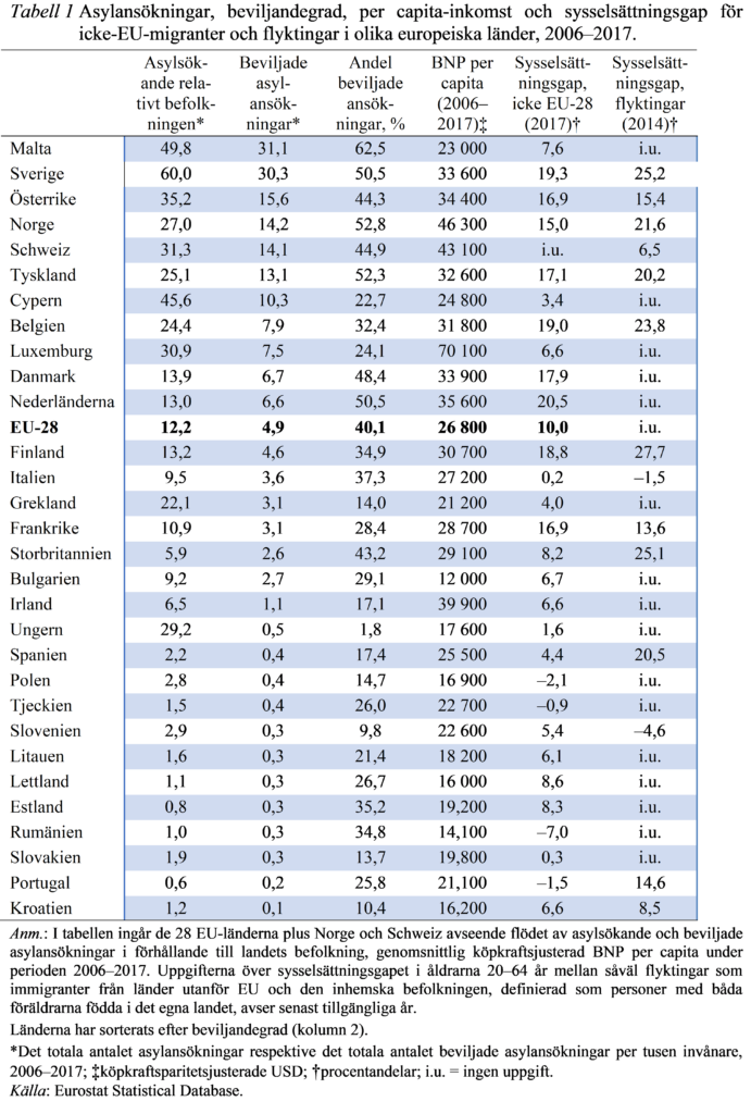 Rätten att beviljas flyktingstatus gäller endast asylsökande som tar sig in i någon av medlemsstaterna. Detta gör att EU-länderna i praktiken kan reglera inflödet genom gränskontroller som gör det svårt för asylsökande att ta sig in i respektive land. Tabell 1 visar att andelen beviljade asylansökningar varierar mellan 2 och 62 procent under perioden 2006–2017. Ur tabellen framgår också att rikare länder tenderar att ha en mer generös flyktingpolitik. Skillnaderna är dock klart större än vad som kan förklaras av skillnader i BNP per capita och den offentliga sektorns storlek. Vidare framgår att det i de flesta europeiska länder finns ett stort sysselsättningsgap, där utomeuropeiska invandrare tenderar att ha avsevärt lägre sysselsättningsgrad än den inhemska befolkningen.