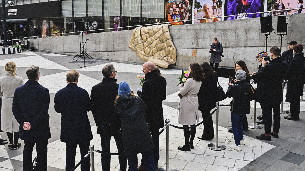 Kulturhusets ägare, Stockholms stad, valde sedan att sätta upp ett konstverk för att hedra offren för terrorattacken på samma plats som Stina Oscarson ville att hennes manus skulle iscensättas. Konstverket, som är ett täcke av brons, fick titeln Fredad plats.