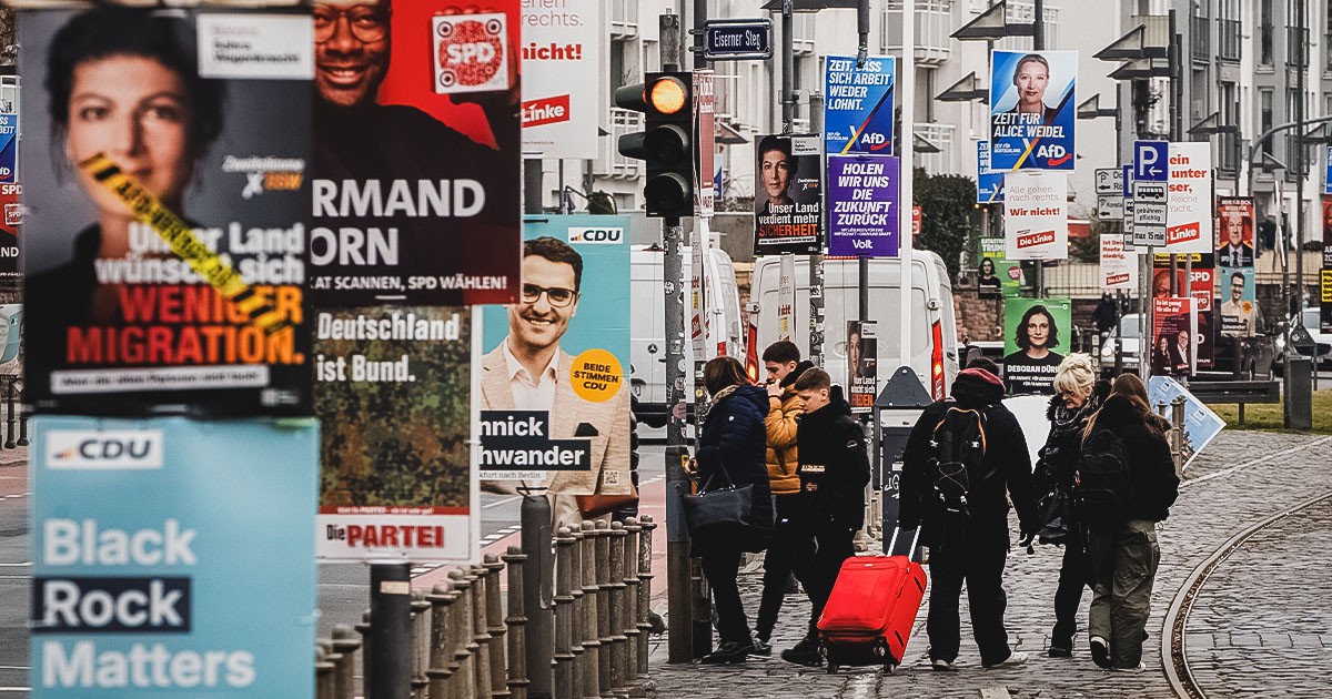 Valaffischer från diverse tyska partier på lyktstolpar, Frankfurt, den 20 februari 2025. Foto: Michael Probst/AP/TT