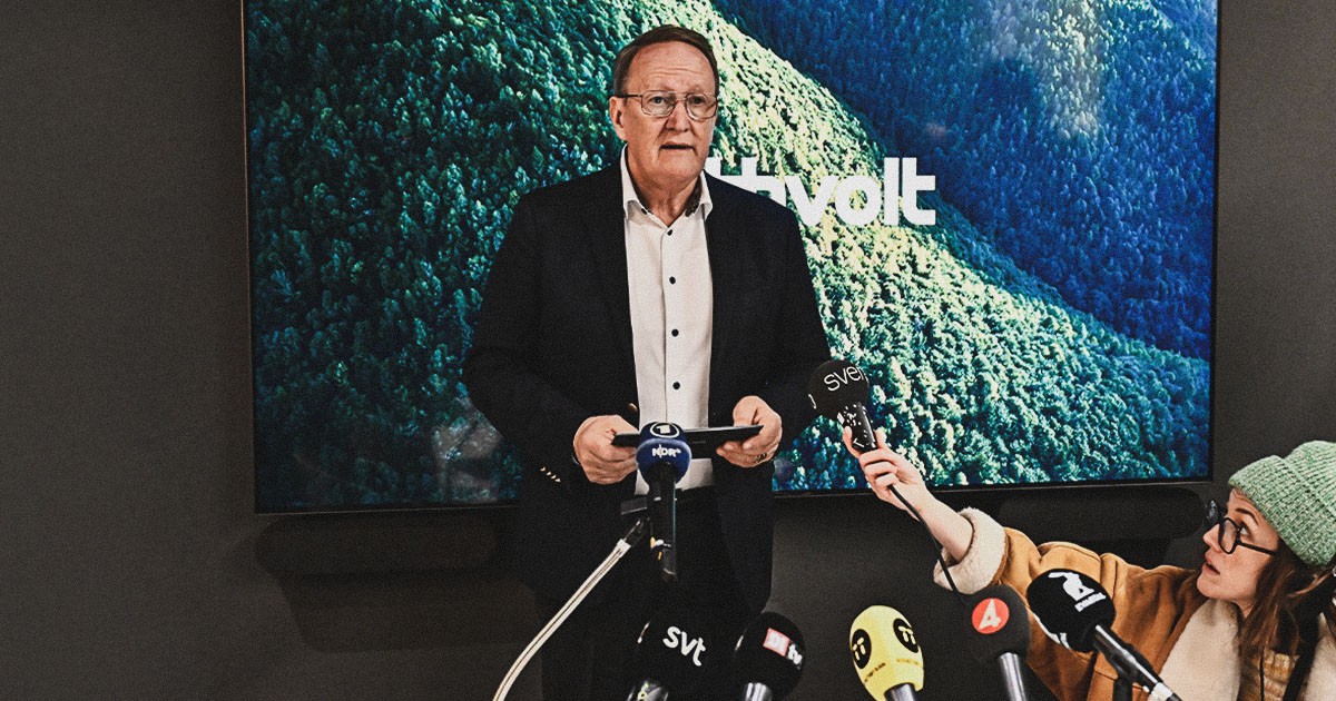 Northvolts interimordförande Tom Johnstone uttalar sig på Northvolts kontor i Stockholm efter bolagets konkursbesked, den 12 mars 2025. Foto: Jonas Ekströmer/TT
