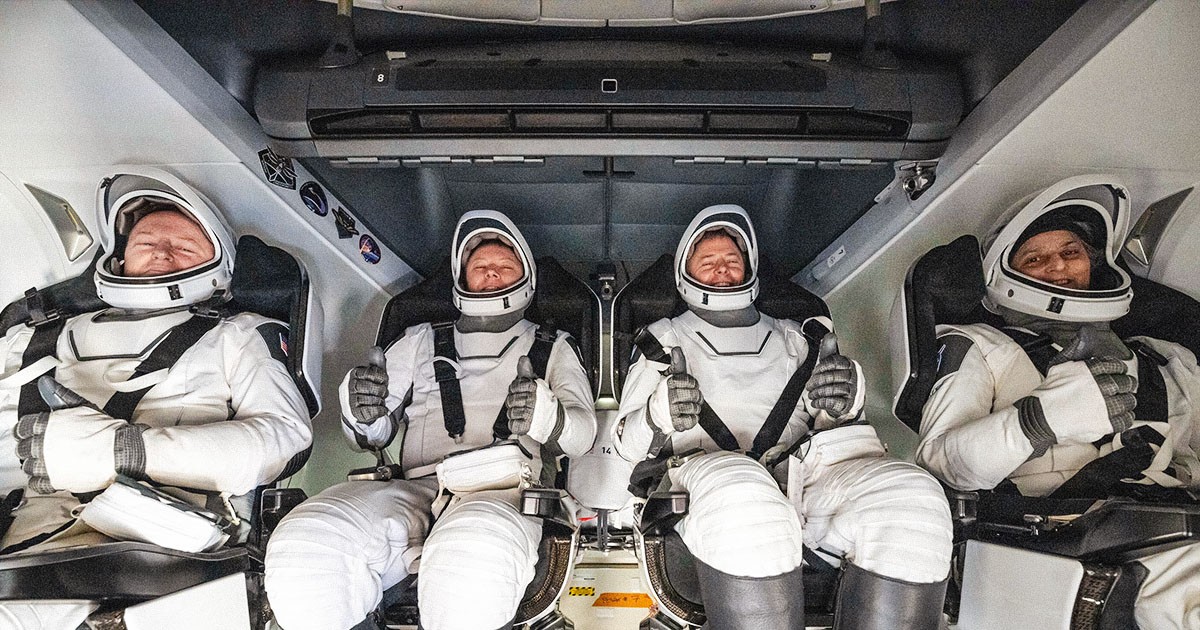 Den amerikanske astronauten Butch Wilmore, Rysslands Alexander Gorbunov och Nasaastronauterna Nick Hague och Suni Williams sitter i en SpaceX-kapsel ombord på bärgningssfartyget Megan efter landningen utanför Floridas kust, den 18 mars 2025. Foto: Keegan Barber/AP/TT