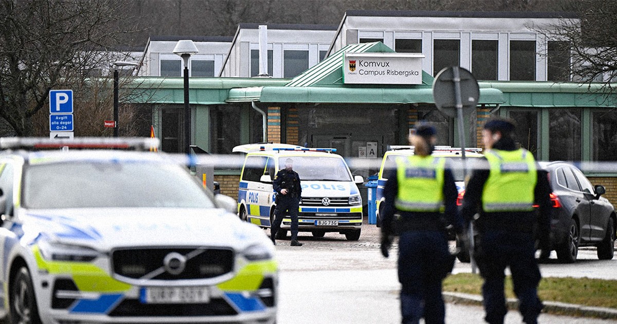 Polis runt Komvux campus Risbergska dagen efter masskjutningen, 5 februari. Christine Olsson/TT