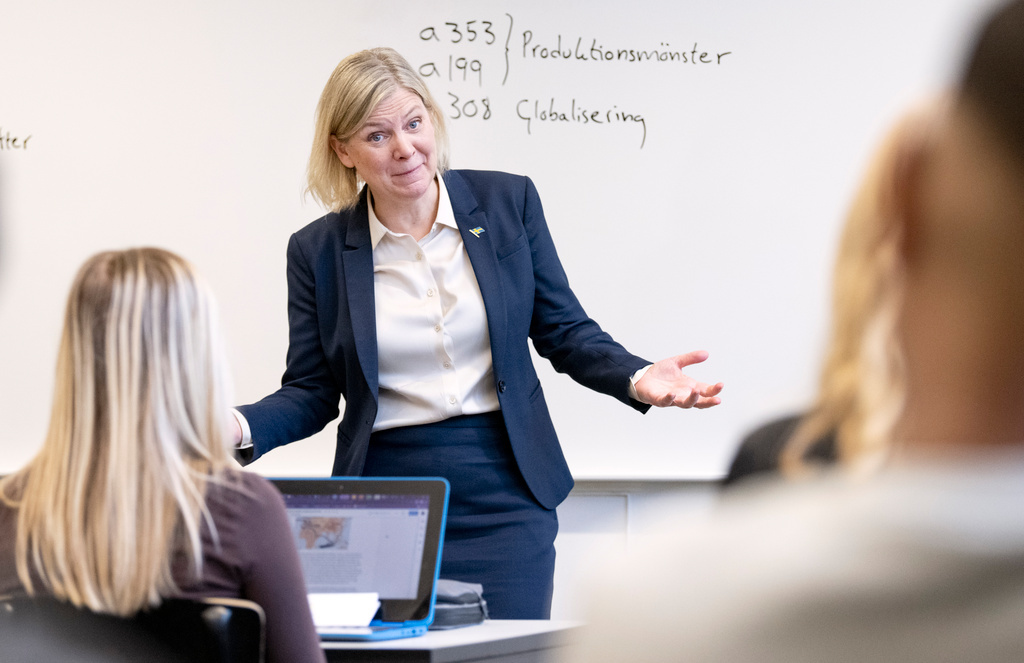 Statsminister Magdalena Andersson (S) frågas ut av elever på Mellersta förstadsskolan i Malmö. Foto: Johan Nilsson/TT.