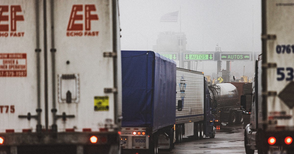 Lastbilar väntar på att korsa USA:s gräns på Peace Bridge, nära Buffalo, den 27 februari 2025. Foto: Lauren Petracca/AP/TT