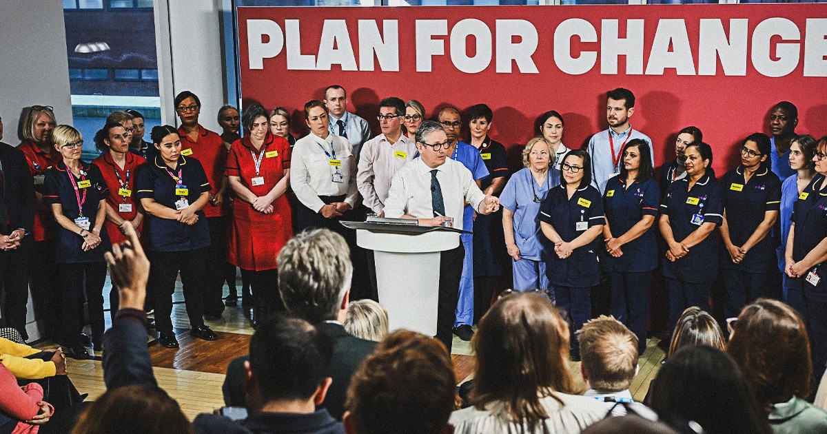 Storbritanniens premiärminister Keir Starmer under en presskonferens framför sjukvårdspersonal, den 6 januari 2025. Foto: Leon Neal/AP/TT