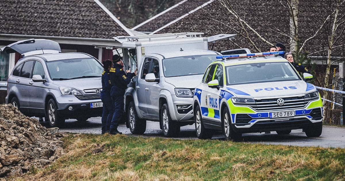 Polis med kriminaltekniker på plats innanför avspärrningarna i Åryd utanför Karlshamn på tisdagen efter att polis skjutit verkanseld i samband med ett utredningsärende. Närliggande lägenheter evakuerades medan polisen sökte efter farliga föremål. Foto: Johan Nilsson/TT