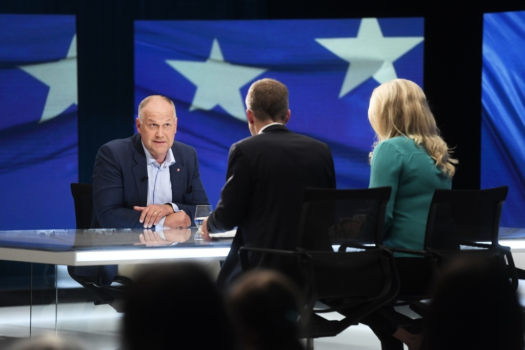 ”Likt prästernas husförhör förr står i dag journalisterna i SVT för folkets uppfostran”, skriver Carl-Vincent Reimers. I bilden från augusti 2018 intervjuas Jonas Sjöstedt (V) av Anders Holmberg och Camilla Kvartoft, SVT. Foto: Urban Andersson/TT.