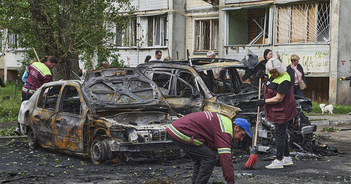 Arbetare städar upp efter en rysk drönarattack, Kiev, den 4 maj 2025. Foto: Efrem Lukatsky/AP/TT