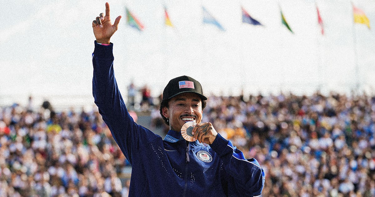 Nyjah Huston, USA, poserar med sin bronsmedalj efter herrarnas street-skateboardfinal under sommar-OS, den 29 juli 2024. Foto: Frank Franklin II/AP/TT