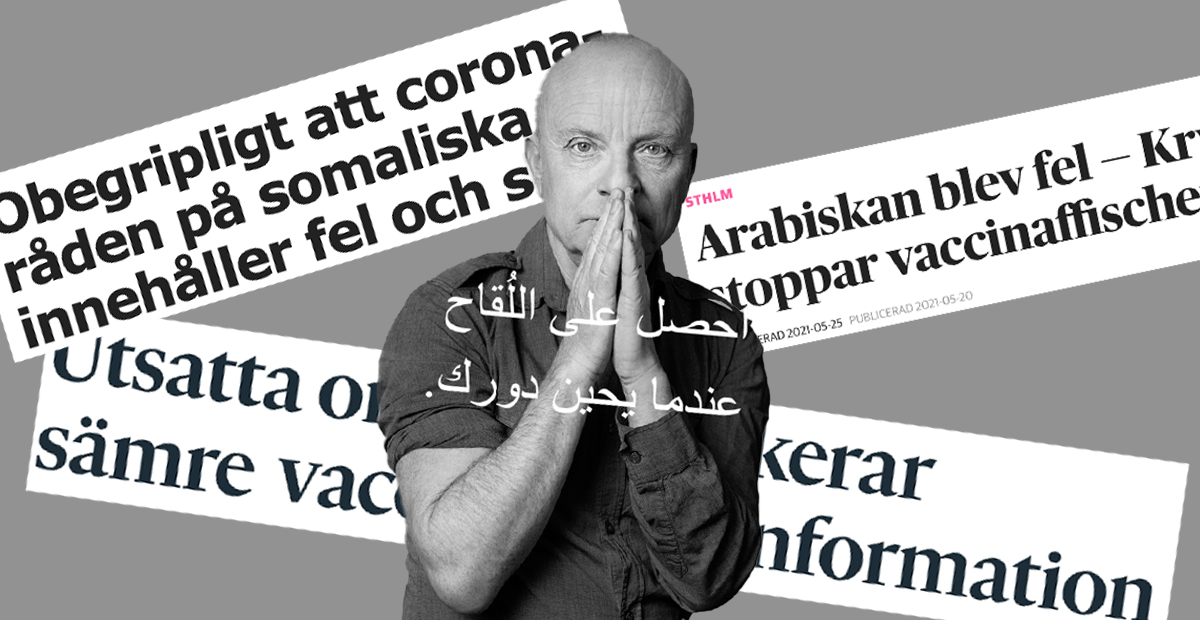 I mitten Jonas Gardell, som är del av kampanjen #kavlaupp. Texten är på arabiska och uppmanar till vaccinering. Den rörliga affischen med Gardell visas på digitala utomhustavlor i hela landet. Rubrikerna kommer från Aftonbladet, Hallandsposten och Dagens Nyheter. Kollage: Kvartal. Foto: Mattias Edwall.