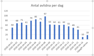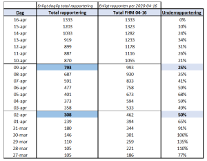 - Jag ska här nämna att på grund av de, per den 16 april, 18 avlidna utan datum avliden kan siffrorna jag här presenterar som procentuell underrapporteringen avvika med några få procent, då jag inte kan placera ut avlidna utan datum i analysen. De antas därför vara 18 från dag 1 vilket inte är helt rättvisande. Detta påverkar dock inte slutsatserna eller mönstret.