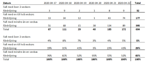 - Myndighetens uttalande om eftersläpningen på presskonferensen den 20 april är baserat på en (1) dags statistik. ”Vi vet att eftersläpningen är inte så jättestor längre, att åtminstone 50% av alla fall ligger på de närmaste dagarna, och går man tillbaks sju dagar i tid så har vi fått in minst 90% av fallen.”