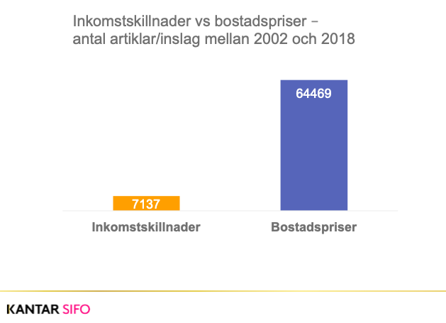 Åren 2002 till 2018 rapporterade redaktionerna cirka 64 500 gånger om ökade bostadspriser men endast cirka 7 100 gånger om ökade inkomstklyftor (se fullständig redovisning av undersökningen i artikelns noter). Det innebär drygt nio inslag eller artiklar om bostadspriserna för varje inslag eller artikel om inkomstklyftor. [1]