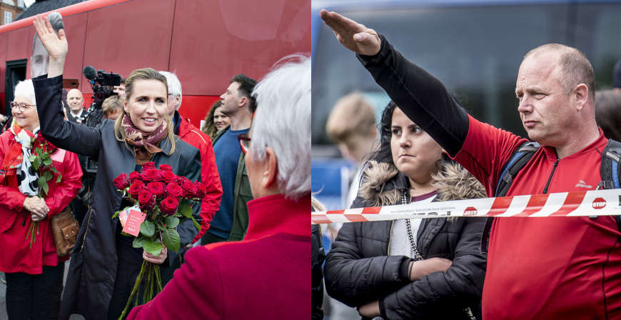 Mette Frederiksen, de danska socialdemokraternas partiledare. Till höger anhängare av det starkt islamfientliga partiet Stram Kurs. (Foto: TT Nyhetsbyrån Henning Bagger respektive Mads Claus Rasmussen)