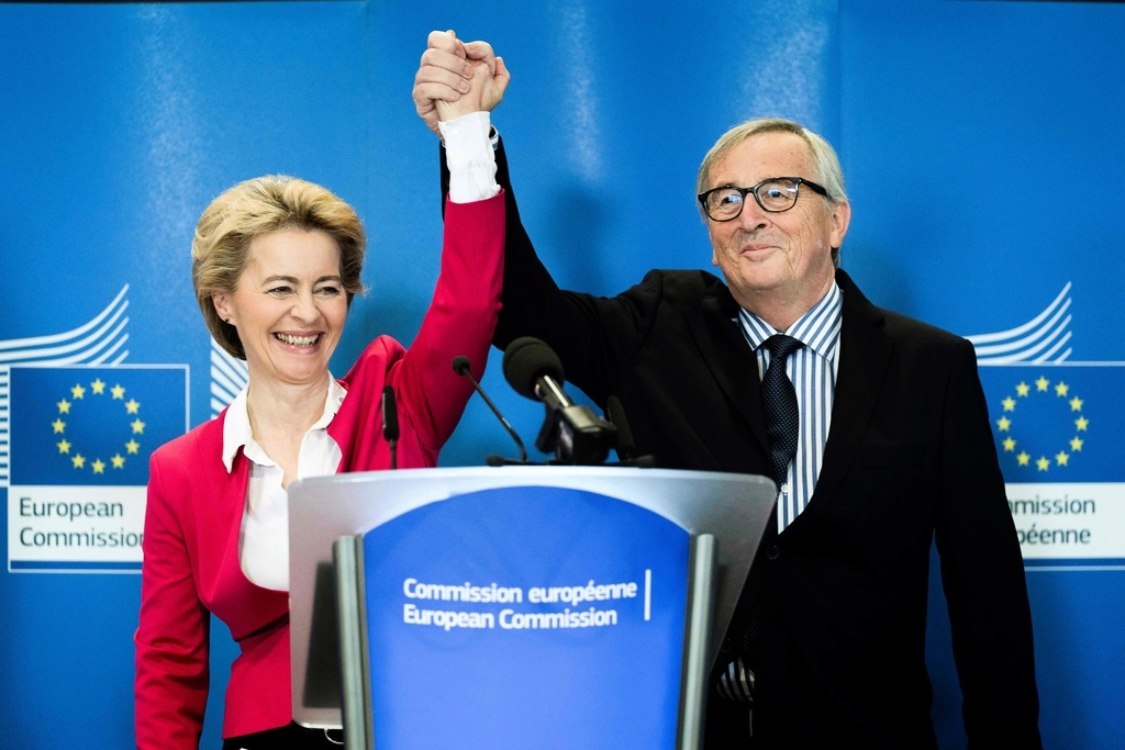 Jean-Claude Juncker, avgående ordförande för EU-kommissionen med sin efterträdare Ursula von der Leyen. Foto: Kenzo Tribouillard/TT.