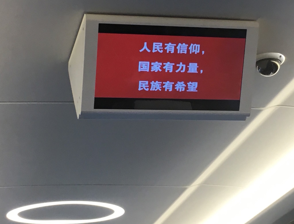 Folkets tro ger nationen styrka och hopp! Propaganda och övervakningskamera på snabbtåget från Peking.