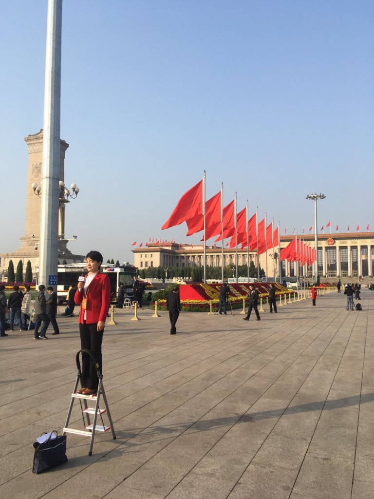 Propagandaarbetare från stats-tv på Himmelska fridens torg.