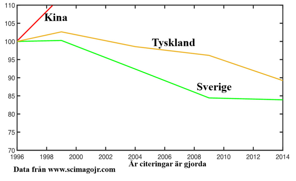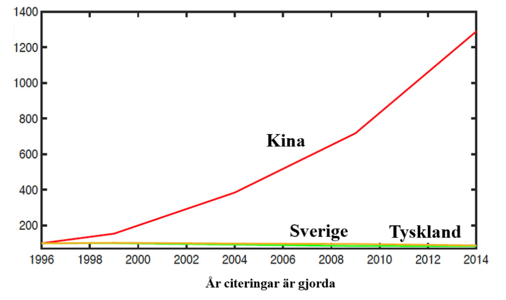 På bilden ser vi antalet citeringar till vetenskapliga publikationer för enskilda länder jämfört med övriga världen med 1996 som basår. Vi ser att Sverige som är grön linje har sjunkit lite jämfört med Tyskland. Gör Sverige något fel jämfört med Tyskland kanske man tänker då? Men så ser vi en som sticker av. Det är den röda linjen uppe till vänster. För att kunna få med Kina i bilden får vi göra ett nytt diagram. Det ser ut så här: