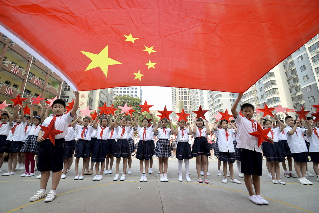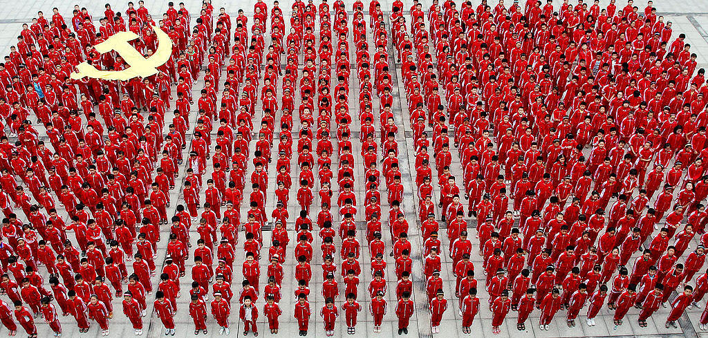 Skolelever firar årsdagen för grundandet av Kinas kommunistparti. Foto: Imagechina/TT