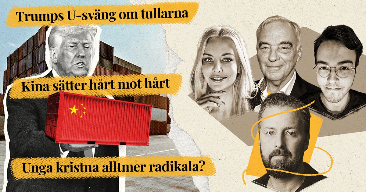 Veckopanelen med Kajsa Ekis Ekman, Lars Leijonborg och Maurits Rannevid under ledning av Magnus Thorén. Tvingades Trump till en U-sväng i tullkriget, eller kan det handla om en slags genial plan? Vad väntar världen nu efter Kinas och USA:s allt högre tariffer? Större fokus måste riktas mot ekonomiskt våld i nära relationer, kräver Riksrevisionen. Nya frågetecken kring Vänsterpartiet och rörelsens arbete mot antisemitism efter polisanmälan mot en av partiets företrädare i riksdagen. Unga kristna blir alltmer dömande, nitiska och traditionella i sina värderingar, varnar präster i Svenska kyrkan. Men är det självklart bara av ondo?