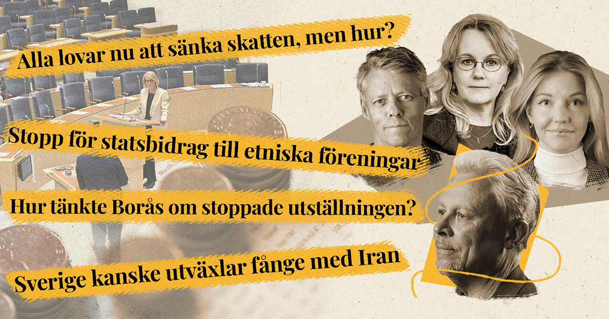 Både opposition och regering lovar nu sänkt inkomstskatt. Höstbudgeten rymmer också sänkt skatt på bensin och diesel. Kulturchefen i Borås ville lyfta bort en del av en Irankritisk utställning för att tolkningarna kunde ”gå åt alla möjliga håll”. Kan det finnas skäl för Sverige att lämna ut en iranier som är dömd för folkrättsbrott för att få en fängslad EU-diplomat fri? Och nu stoppar regeringen statsbidragen till organisationer som bygger på etnicitet.